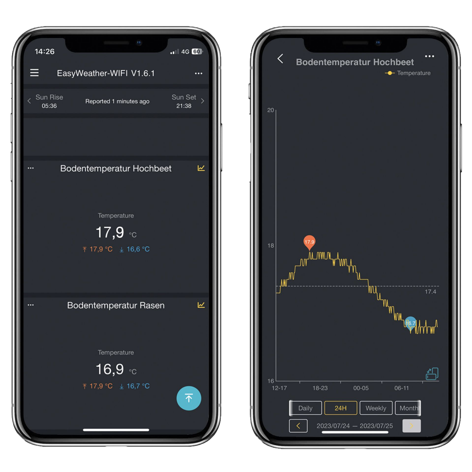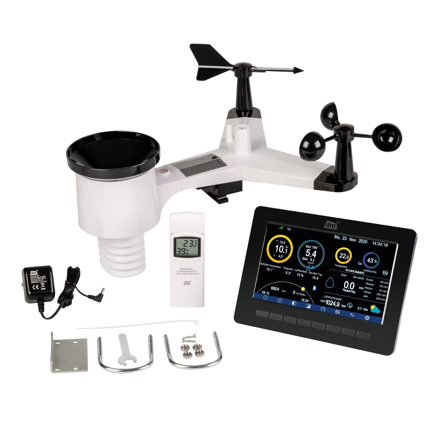 absolu/relativement (avec affichage de tendance), affichage de la température en °C ou °F (affichage de plage via anneau de couleur visuelle), affichage de la température et du point de rosée sensibles, humidité intérieure et extérieure (affichage de plage via anneau de couleur visuel), affichage de phase lunaire, indication de lever du soleil avec SA/SU. L'écran supplémentaire DNT00007 étend votre système dnt WeatherScreen PRO avec une autre unité d'affichage • Convient pour la table (support pliant) et le montage mural (2 œillets de suspension). 1 x Adaptateur d'alimentation. • Affichage avec affichage de la vitesse du vent avec affichage de la route, direction du vent avec rose du vent, variations des tendances/fluctuations, heure, date, indice UV, luminosité/luminosité, précipitations (1 h/24 h/1 semaine/1 mois/total depuis la dernière réinitialisation), affichage graphique des précipitations, prévisions météorologiques pour les prochaines 24 heures, pression atmosphériques. Bodentemperatursensor für WLAN-Wetterstation WeatherScreen PRO Caractéristiques techniques : |Catégorie|: Affichage supplémentaire (accessoires Articles) |Display|: Écran TFT, 17,8 cm (7) |Affichage de l'heure/date |: Oui |Menutaal|: Allemand, Anglais |Boîtier|: Plastique, noir |Tension d'alimentation|: Alimentation (5 V DC/1A) |Dimensions (l x H x P) |: 195 x 140 x 20 mm |Poids|: Affichage 305 g, alimentation 45 g Contenu de l'emballage : 1 x écran supplémentaire. 1 manuel de démarrage rapide Les données sont enregistrées ici comme d'habitude par le capteur solaire extérieur sans fil et les capteurs de climatisation intégrés et affichées à l'écran Extension Station Météo Intérieure DNT Additional Screen For WeatherScreen Pro DNT00007 With Power Supply Station Météo Multi-écran Caractéristiques du produit : • Écran TFT couleur de 17,8 cm (7), 480 x 800 pixels. Les données sont capturées et affichées à l'écran comme d'habitude par le capteur extérieur sans fil à énergie solaire et les capteurs climatiques intégrés. Zusatz-Display für WeatherScreen PRO - Webseite